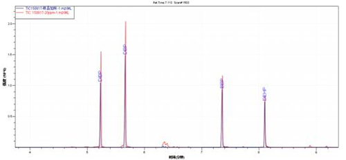 样品加标TIC图(蓝色)与邻苯混标TIC图(红色)