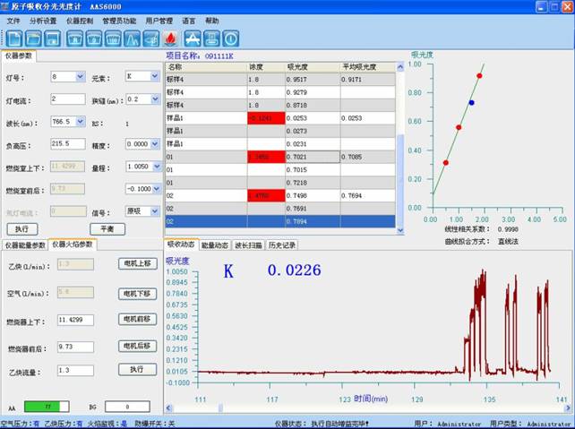 样品测试:于原子吸收光谱仪波长766.5nm处,使用空气-乙炔火焰,以水调零,测量试液的吸光度,减去随同试料的空白试验溶液的吸光度,从工作曲线上查出相应的钾浓度。