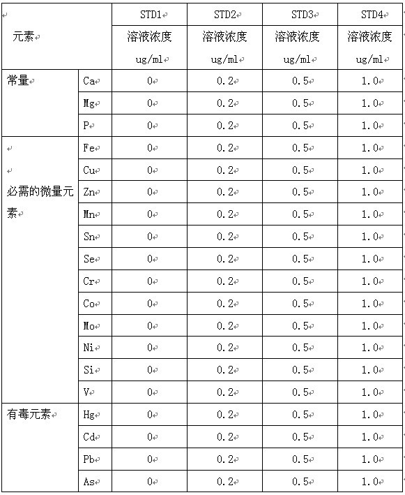 用1000ug/ml 的单标准贮存溶液逐级配制成 100ug/ml溶液,再逐级配制成混合标准溶液10μg/ml、1μg/ml酸度为10%(V/V)。