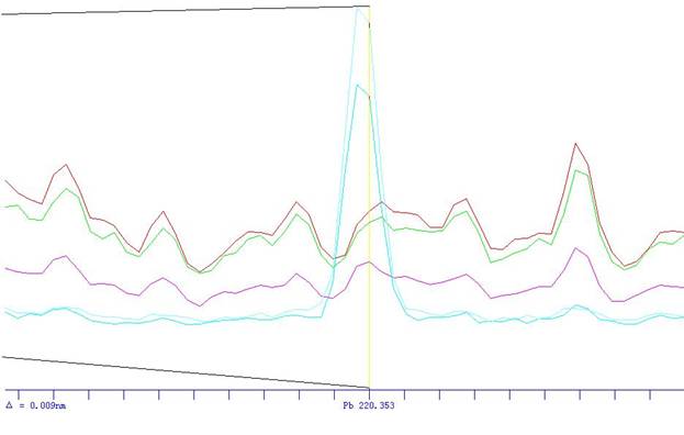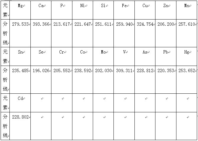 根据ICP软件谱线库提供所有元素不同谱线,首先选择被测元素灵敏度高 的谱线,其次考虑不受样品基体及被测元素相互之间干扰小的谱线的原则,选择分析线如下。