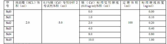 使用镉(Cd)标准使用溶液(0.01ug/ml),优级纯盐酸(HCL) ,0.1%镉(Cd)专用分析 2 号试剂,去离子水(电阻率≥10M欧姆)等试剂。
