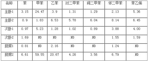 在刚装修完的两套住宅的三处不同地点进行取样并分析7种苯系物的含量,测试结果见表7。