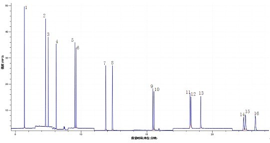1、萘,2、苊烯,3、苊,4、芴,5、菲,6、蒽,7、荧蒽,8、芘,9、苯并[a]蒽,10、屈,11、苯并[b]荧蒽,12、苯并[k]荧蒽,13、苯并[a]芘,14、茚并[1,2,3 cd] 苝,15、二苯并[a,h]蒽,16、苯并[j,h,i] 苝