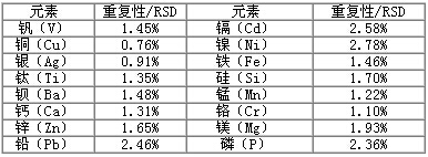 连续测试6份平行样品,计算6次测试数据的相对标准偏差,即为重复性数据,结果见下表