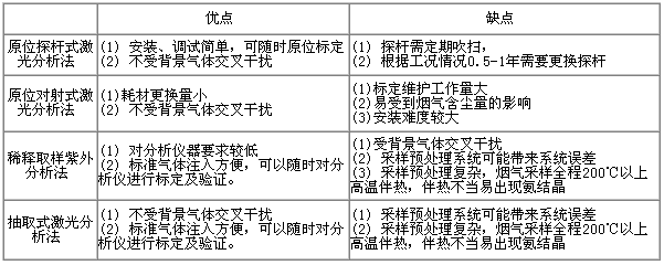 脱硝氨逃逸浓度的量级一般都是几个ppm,对其准确测量比较困难。目前国内外用于烟气脱硝系统氨逃逸在线监测的方法主要有以下几种,优缺点如下: