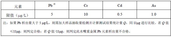 (2)卫生部《生活饮用水输配水设备及防护材料的卫生评价规范》主要对水嘴中镉、铅、砷、汞、铬、铝六种重金属元素的析出量予以限定,另外对于金属材质水嘴,增加了铁、锰、铜、锌、镍的析出量限定要求,限定要求如表2所示: