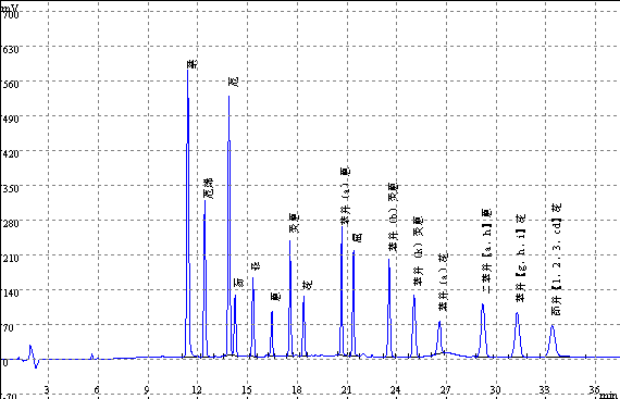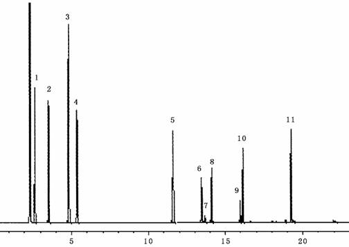 1. 苯 2.甲苯 3.间二甲苯 4.邻二甲苯 5.正十四烷 6.甲苯二异氰酸酯(I)7. 甲苯二异氰酸酯(II)9.己二异氰酸酯 10.异佛尔酮二异氰酸酯(I)11. 异佛尔酮二异氰酸酯(II) 12.二苯甲烷二异氰酸酯