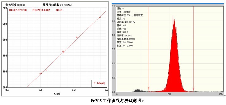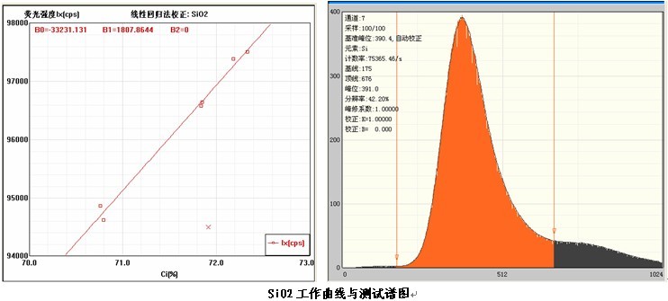 各个元素的工作曲线与测试谱图,其中B0为曲线节距;B1:为曲线斜率;在测试谱图中有元素的测试信息:计数率,采样时间,分辨率等。