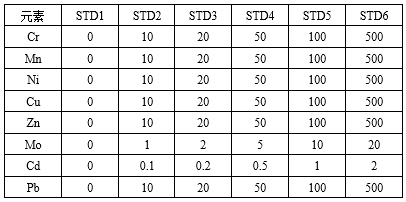 利用逐级稀释法,采用1%硝酸溶液,按表2配制各待测元素标准溶液,且加入Rh元素作为内标(最终Rh浓度20μg/L)。