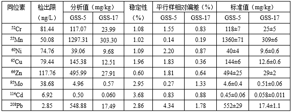 在优化的仪器工作参数下,建立标准溶液工作曲线(线性相关系数达0.999以上),再分别取待测溶液上清液上机测试。其中:取两个平行样测试结果的平均值为分析值;对样品空白溶液平行测定11次,计算11次测试结果的SD,以3×SD/k(k为标准溶液工作曲线的斜率)对应的值为方法检出限。取一份GSS-17样品溶液进行稳定性考查,即间隔2min采集一个数据,连续采集7组数据,计算7组数据的RSD,作为稳定性指标。所得实验数据见表4。