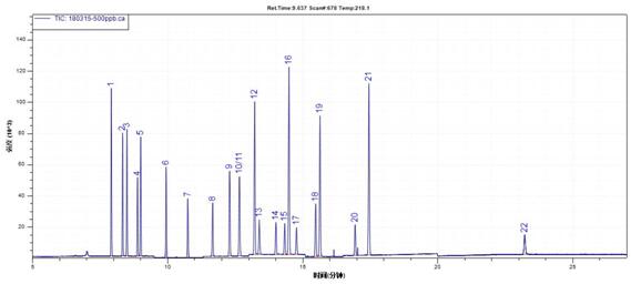 1. 四氯间二甲苯(替代物);2. 蒽-d10(内标物);3. PCB 28;4. PCB 52;5. PCB 101;6. PCB81;7. PCB 77;8. PCB 123;9. PCB 118;10. PCB 114;11. PCB153;12. PCB105;13. PCB 138;14. PCB126;15. PCB167;16. PCB156;17. PCB157;18. PCB180;19. PCB169;20. PCB189;21. PCB 209(内标)