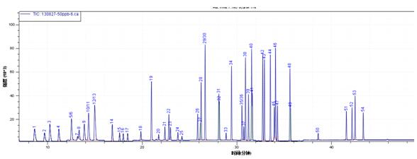 采用GC-MS 6800气相色谱-质谱联用仪,测试土壤、沉积物或固体废物中的多环芳烃、多氯联苯、有机氯农药、挥发性有机物及卤代烃类物质,各物质分离效果良好,灵敏度高,线性范围宽,能达到较好的测试效果。