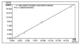 准确吸取浓度为10ug/mL的甜蜜素标准溶液10ul50ml离心管中对应衍生物浓度分别为2ug/mL10ug/mL20ug/mL100ug/mL200ug/mL,按照上述标样衍生化步骤进行衍生化,进行线性测试。实验所得线性方程为:y=940.43x-3525.57,线性相关系数为0.9984,如图5所示。